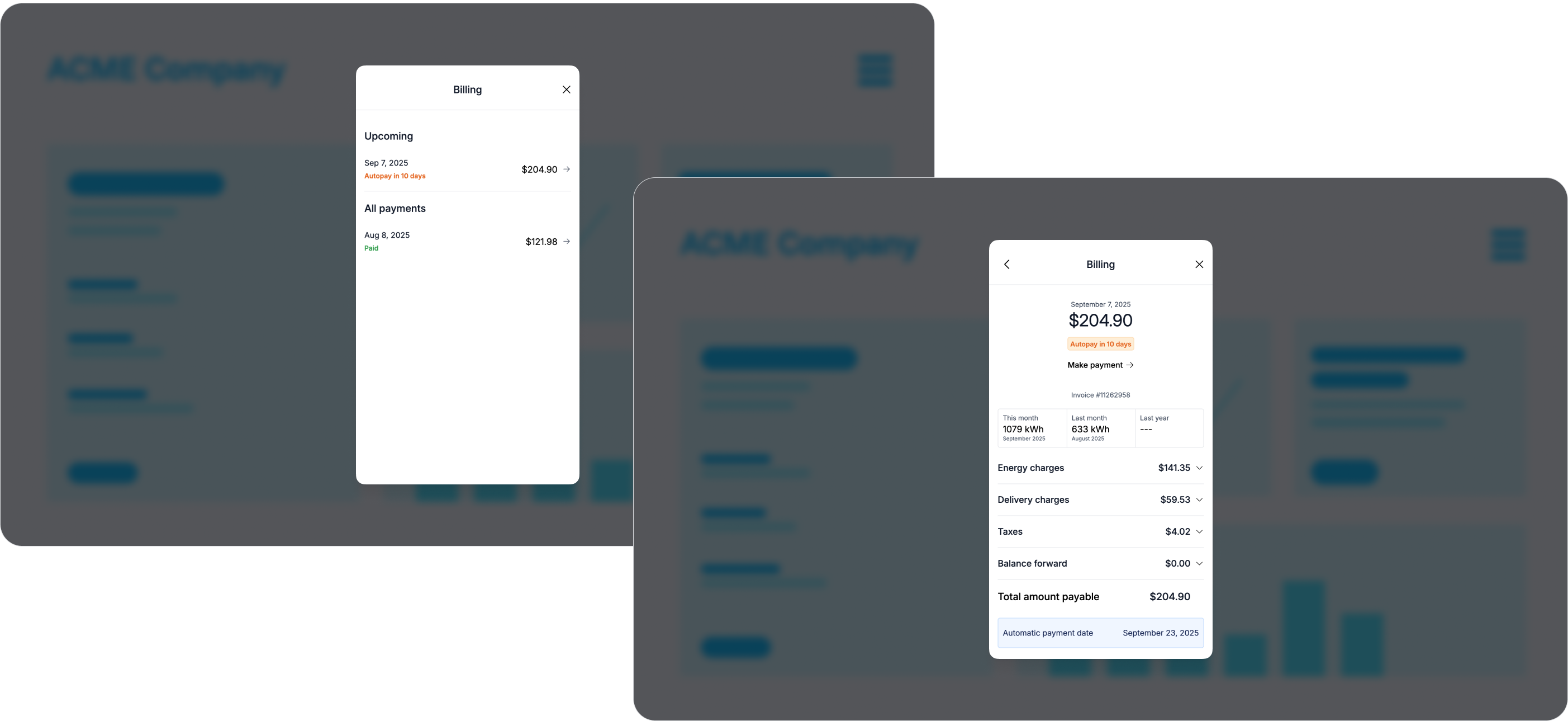 The retail-choice electricity market requires a certain method to bill customers that is based on metered usage. This section covers how to retrieve and update payment methods, billing addresses, and access invoice information. Only AccountToken