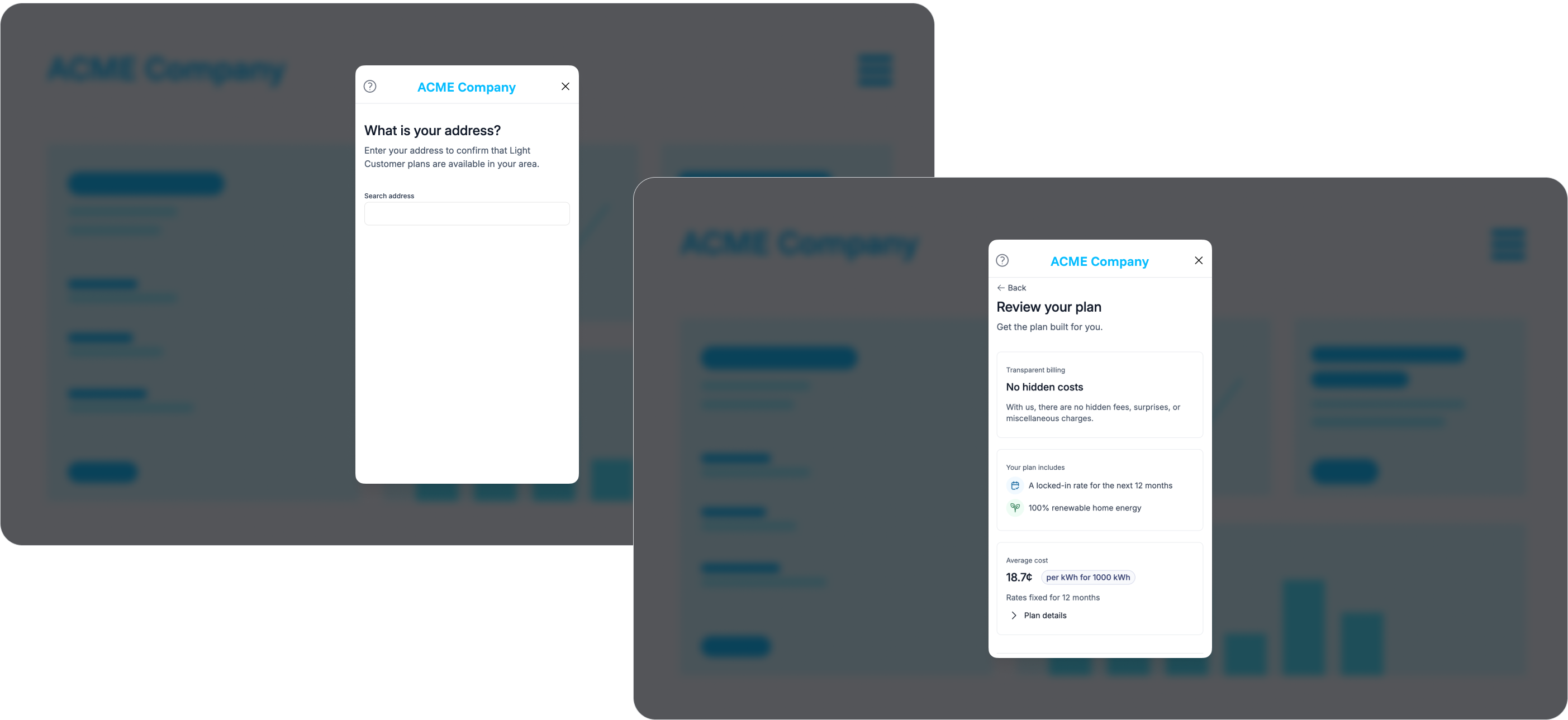 The enrollment experience can be completely customized by using our API with your UI. Light also provides an optional, low-code embedded flow (prebuilt UI) that can be embedded into your website or mobile app. The embedded flow includes a full enrollment experience that appears in a modal overlaying your experience.